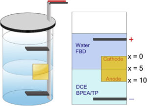 Bipolar electrochemistry is a wireless technique by which surface modifications at the extremities of a conducting object can be accomplished. In this study a new methodology for doing simultaneous electrografting of two different organic films at each end of a gold substrate is reported. A two-phase system consisting of an aqueous and an organic phase is developed to separate the two grafting agents that otherwise would react to form a non-grafting species. The surface modifications are achieved by the simultaneous electrografting of an aryldiazonium salt and a primary alkylamine, which are grafted by reduction and oxidation, respectively. The breadth and thicknesses of the grafted films depend on i.a. the electrical field in the solution, which easily is altered by changing the applied voltage between the feeder electrodes. To demonstrate that the system is not limited to electrografting, the oxidative electropolymerization of thiophene at the anodic end of the electrode was carried out as well. Finally, bipolar experiments using a diazonium salt and thiophene in the same phase were conducted.